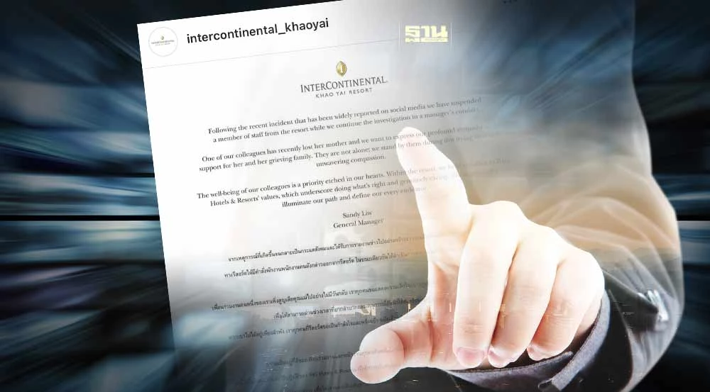 ช่วงค่ำที่ผ่านมามีแถลงการณ์ของ รีสอร์ตอินเตอร์คอนดิเนนตัลเขาใหญ่ (Intercontinental Khaoyai Resort ) โดยระบุชื่อของผู้ออกแถลงการณ์คือ แซนดี้ ลิว ผู้จัดการทั่วไป โดยเนื้อหาระบุว่า