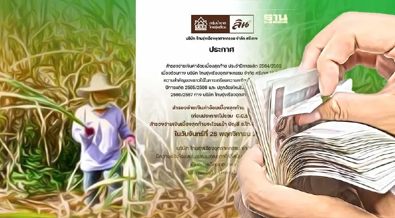 ทาง บริษัท ไทยรุ่งเรืองอุตสาหกรรม จำกัด จึงสำรองจ่ายเงินค่าอ้อยเบื้องสุดท้าย 15 บาท / ตัน (ก่อนประกาศไม่รวม C.C.S.) สำรองจ่ายเงินเบื้องสุดท้ายจะโอนเข้า บัญชี ธนาคารไทยพาณิชย์ของชาวไร่ในวันจันทร์ที่ 28 พฤศจิกายน 2565 อย่างไรก็ดี ทางบริษัทมีความจริงใจและขอบคุณชาวไร่ที่สนับสนุนและให้ความร่วมมือเป็นอย่างดีตลอดมาและตลอดไป