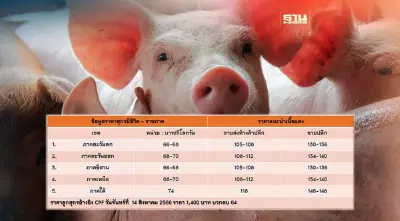ลูกสุกรขุนเล็ก 16 กิโลกรัม วันจันทร์ ที่ 14 สิงหาคม 2566: 1,400 บาท บวก/ลบ 64