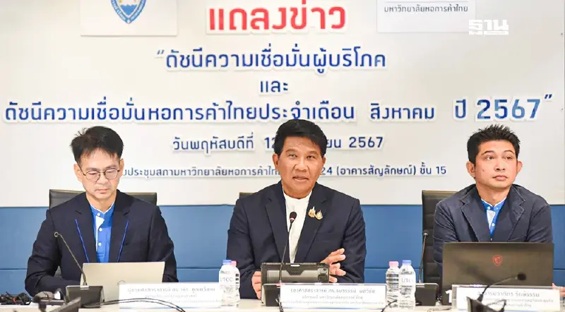 วันที่ 12 กันยายน 2567 นายธนวรรรน์ พลวิชัย อธิการบดีมหาวิทยาลัยหอการค้าไทยและประธานที่ปรึกษาศูนย์พยากรณ์เศรษฐกิจและธุรกิจ เปิดเผยว่า ดัชนีความเชื่อมั่นของผู้บริโภคเดือน ส.ค. 67 ปรับตัวลงมาอยู่ที่ระดับ 56.5 จากเดือน ก.ค. 67 อยู่ที่ระดับ 57.7 เป็นการลดลงต่อเนื่องเป็นเดือนที่ 6 และอยู่ในระดับต่ำสุดในรอบ 13 เดือนนับตั้งแต่เดือน ส.ค. 66 เป็นต้นมา