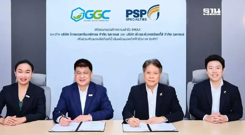 รายงานข่าวจาก บริษัท โกลบอลกรีนเคมิคอล จำกัด (มหาชน) หรือ GGC ผู้นำด้านธุรกิจเคมีชีวภาพ และบริษัทแกนนำในธุรกิจผลิตภัณฑ์เคมีเพื่อสิ่งแวดล้อม Green Flagship Company ของ GC Group นำโดย นายกฤษฎา ประเสริฐสุโข กรรมการผู้จัดการ ได้ลงนามบันทึกความเข้าใจ (MOU) กับ บริษัท พี.เอส.พี. สเปเชียลตี้ส์ จำกัด (มหาชน) หรือ PSP ผู้นำด้านโซลูชันน้ำมันหล่อลื่น นำโดย นายเสกสรร ครองพาณิชย์ รองประธานเจ้าหน้าที่บริหาร