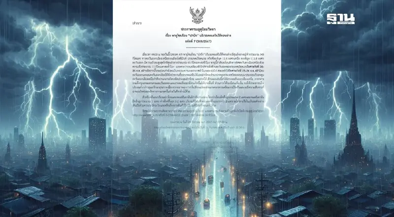 นางสาวสุกันยาณี ยะวิญชาญ อธิบดีกรมอุตุนิยมวิทยา ออกประกาศกรมอุตุนิยมวิทยาเรื่อง พายุโซนร้อน "ปาบึก" บริเวณทะเลจีนใต้ตอนล่าง ฉบับที่ 7 (349/2567) ณ วันที่ 24 ธันวาคม 2567 เวลา 05.00 น.