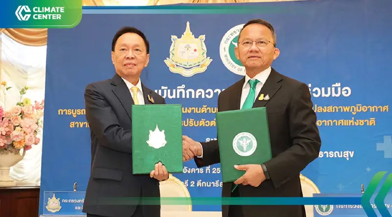 โดยนายเถลิงศักดิ์ เพ็ชรสุวรรณ รองปลัดกระทรวงทรัพยากรธรรมชาติและสิ่งแวดล้อม รักษาราชการแทนปลัดกระทรวงทรัพยากรธรรมชาติและสิ่งแวดล้อม ร่วมลงนามบันทึกความเข้าใจความร่วมมือ กับ นายแพทย์โอภาส การย์กวินพงศ์ ปลัดกระทรวงสาธารณสุข เพื่อเสริมสร้างความร่วมมือและเตรียมความพร้อมในการรับมือต่อผลกระทบจากการเปลี่ยนแปลงสภาพภูมิอากาศ เชื่อมโยงการวางแผนตามแนวทางการปรับตัวและนำไปสู่การปฏิบัติอย่างมีส่วนร่วม