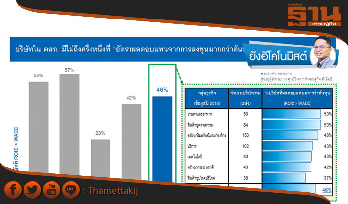 เพื่อให้เห็นภาพการวิเคราะห์การเติบโตอย่างยั่งยืนของกิจการในระยะยาว ผมขอนำเครื่องมือดังกล่าวมาประยุกต์ใช้กับบริษัทใน ตลท. ซึ่งให้ผลที่น่าสนใจดังนี้ ภาพรวมการเติบโตของกิจการในระยะยาวของบริษัทใน ตลท. มีทิศทางลดลง กล่าวคือในปี 2012 จำนวนบริษัทที่มี ROIC > WACC อยู่ที่ 53% ของจำนวนบริษัททั้งหมด ตกลงมาอยู่ที่ 42% ในปี 2015 อย่างไรก็ดี ในปี 2016 ภาพรวมของบริษัทใน ตลท. เริ่มมีผลการดำเนินงานที่ดีขึ้นเล็กน้อยสอดคล้องกับแนวโน้ม ROE ที่เราได้วิเคราะห์ไปในฉบับที่แล้ว โดยจำนวนบริษัทที่มี ROIC > WACC ในปี 2016 ปรับตัวดีขึ้นมาอยู่ที่ 46% จากจำนวนบริษัททั้งสิ้น 510 แห่ง (ไม่รวมกลุ่มธุรกิจการเงิน) และเมื่อเจาะลึกลงเป็นรายกลุ่มธุรกิจพบว่า กลุ่มธุรกิจที่มีโอกาสเติบโตอย่างยั่งยืนในระยะยาวได้แก่ ธุรกิจเกษตรและอาหาร ธุรกิจสินค้าอุตสาหกรรม ธุรกิจอสังหาริมทรัพย์และก่อสร้าง เพราะ3 กลุ่มธุรกิจนี้ มีจำนวนบริษัทที่มี ROIC > WACC ในระดับที่มากกว่าค่าเฉลี่ยภาพรวม ในขณะที่กลุ่มธุรกิจที่ต้องปรับตัวได้แก่ กลุ่มธุรกิจเทคโนโลยี กลุ่มธุรกิจบริการ กลุ่มธุรกิจทรัพยากรธรรมชาติ และกลุ่มธุรกิจสินค้าอุปโภคบริโภค เนื่องจากเป็นกลุ่มที่มี ROIC > WACC มีจำนวนน้อยกว่าค่าเฉลี่ยภาพรวม ผมขอสรุปสาระสำคัญสั้นๆ จากเครื่องมือ ROIC และ WACC ว่า “บริษัทไทยในตลท. มีจำนวนไม่ถึงครึ่งของจำนวนบริษัทที่จดทะเบียนทั้งหมดที่มีโอกาสเติบโตอย่างยั่งยืน และมีกลุ่มบริษัทที่ ROIC ตํ่ากว่า WACC มากกว่าครึ่งจำเป็นต้องปรับตัว”