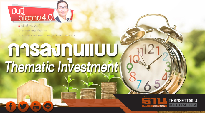 การลงทุนแบบ Thematic Investment นั้นเป็นการลงทุนโดยอาศัยการจับทิศทางกระแสหลักของโลกที่กำลังเปลี่ยนไปซึ่งจะมีการวิเคราะห์ถึงแนวโน้มการเปลี่ยนแปลงของเศรษฐกิจและสังคมในระยะยาว เพื่อกำหนด “ธีม” ในการลงทุน เช่น การเปลี่ยนถ่ายเข้าสู่สังคมผู้สูงอายุ การขยายตัวของสังคมเมือง หรือการเติบโตของธุรกิจที่เกี่ยวข้องกับเทคโนโลยี เป็นต้น และถูกนำมาพัฒนาเป็นพอร์ตโฟลิโอการลงทุน ซึ่งจะมุ่งเน้นการลงทุนในกลุ่มอุตสาหกรรมที่คาดว่าจะได้รับประโยชน์จากการเปลี่ยนแปลงระยะยาวดังกล่าว โดยการลงทุนในลักษณะนี้จะมีความแตกต่างจากการลงทุนของกองทุนรวมโดยทั่วไปในหลายปัจจัย ไม่ว่าจะเป็นวัตถุประสงค์ของการลงทุน กรอบระยะเวลาในการลงทุน หลักเกณฑ์ในการคัดเลือกหลักทรัพย์ที่จะลงทุน รวมไปถึงการวัดผลการดำเนินงานของกองทุน