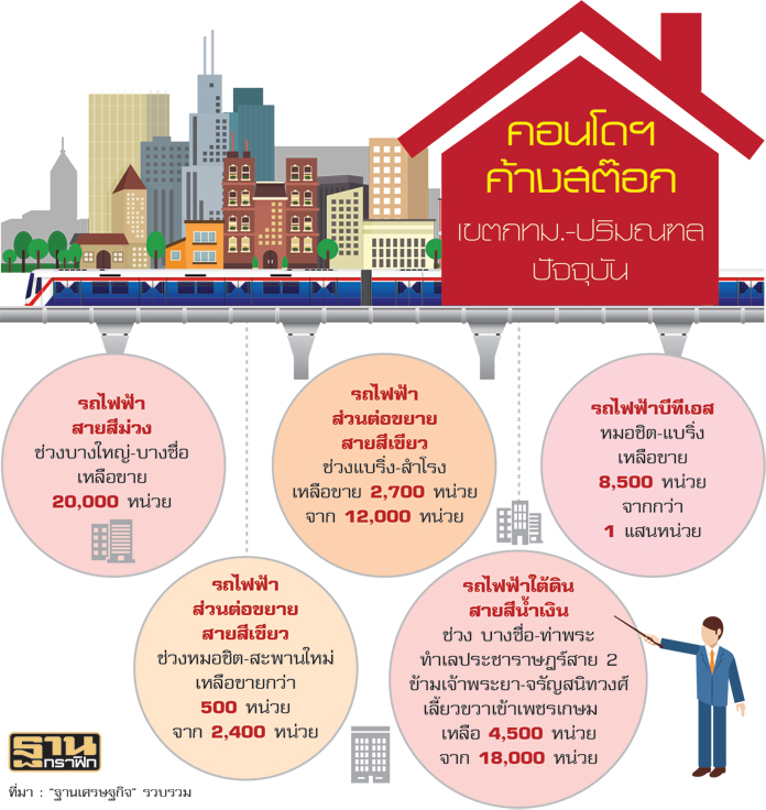 ขณะที่นาย สุรเชษฐ กองชีพ รองผู้อำนวยการ ฝ่ายวิจัยและพัฒนา คอลลิเออร์ส อินเตอร์เนชั่นแนล (ประเทศไทย) สะท้อนว่า โดยรวม คอนโดในเขตกทม.และปริมณฑลรอการขายจำนวน กว่า 40,000 หน่วย แยกเป็นกทม. 31,000 หน่วย อีก กว่า 10,000 เป็นปริมณฑล ทำเลวิกฤติคือสายสีม่วง เหลือขาย กว่า 10,000 หน่วย แยกเป็น ช่วงเตาปูน-วงสว่าง กว่า 2,000 หน่วยและ ฝั่งนนทบุรีอีก กว่า 8,000 หน่วย