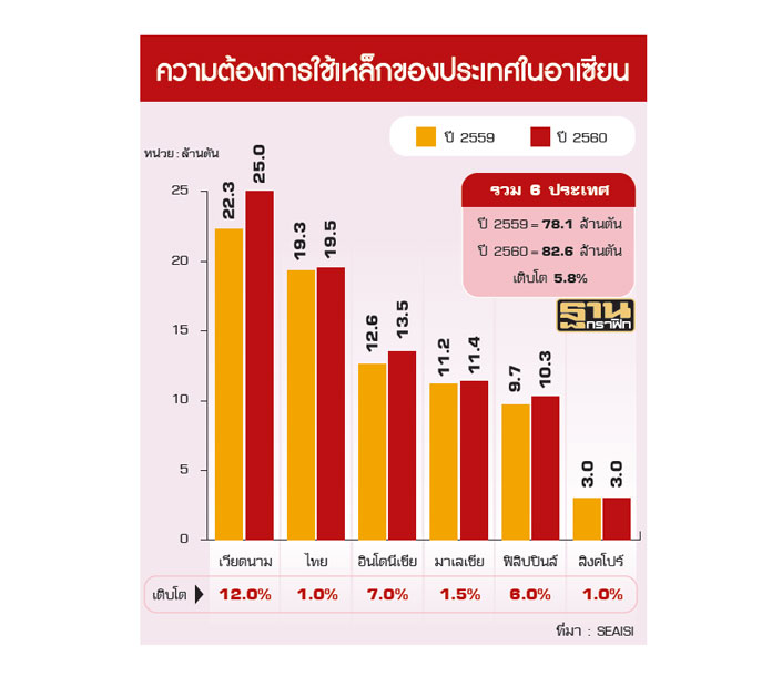 สำหรับเหล็กไทย นับตั้งแต่ปี2558 ที่เวียดนามมีความต้องการใช้เหล็กมากที่สุดในอาเซียน ขยับขึ้นมาเป็นที่ 1 แซงหน้าไทย และมีแนวโน้มทิ้งห่างไทยอย่างต่อเนื่องทุกปีนับจากนี้ไป โดยเวียดนามมีความต้องการใช้เหล็กในประเทศปีนี้เพิ่มขึ้น(ดูตาราง) เปรียบเทียบกับไทยที่คาดการณ์ว่าความต้องการใช้เหล็กปีเดียวกันอยู่ที่ 19.5 ล้านตัน เติบโตขึ้นมาเพียง1% อีกทั้งไม่มีโรงถลุงเหล็กในประเทศ แม้ก่อนหน้านี้ มีแผนตั้งไข่มาหลายรอบ จนสุดท้ายก็แท้งไปในที่สุด