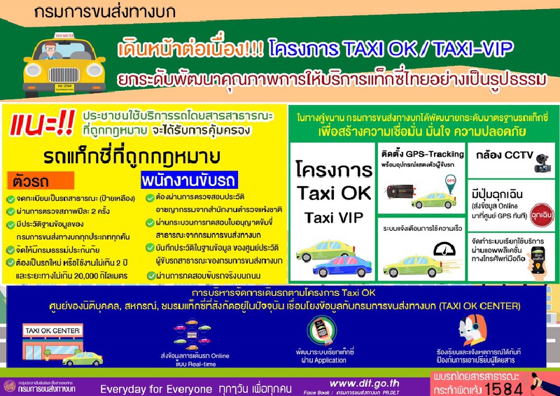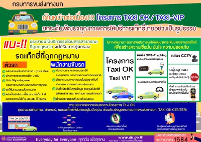 กรมการขนส่งทางบก เดินหน้าโครงการแท็กซี่ โอเค แท็กซี่ระดับวีไอพี หวังยกระดับพัฒนาคุณภาพการให้บริการแท็กซี่ไทยอย่างเป็นรูปธรรม เพื่อสร้างความเชื่อมั่นและเพิ่มทางเลือกในการเลือกใช้บริการให้แก่ประชาชน ควบคู่กับการกำกับ ควบคุม คัดกรอง และบังคับใช้กฎหมายกับรถแท็กซี่ในระบบอย่างเด็ดขาด จริงจังในทุกประเด็น พร้อมดำเนินการทุกมาตรการเพื่อให้เกิดการพัฒนายกระดับการให้บริการแท็กซี่ในประเทศไทย ภายใต้การดูแลและสนับสนุนของภาครัฐ