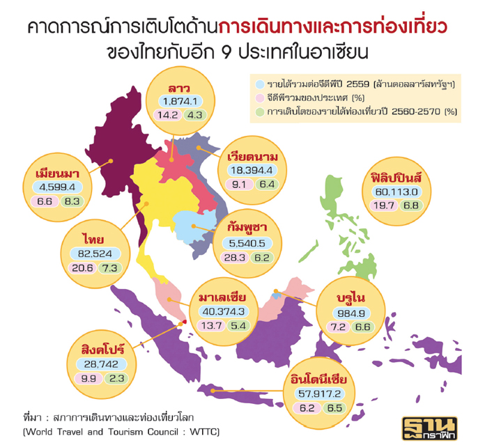 อุตสาหกรรมท่องเที่ยวสร้างรายได้2.9 ล้านล้านบาท (8.25 หมื่นล้านดอลล่าร์สหรัฐ) ให้กับผลิตภัณฑ์มวลรวมภายในประเทศของไทยหรือ 20.6% ของจีดีพีรวมปี 2559ซึ่งเมื่อเทียบกับอีก 9 ประเทศในอาเซียน จะเห็นชัดเจนว่ามีการเติบโตมากที่สุด รองมาเป็นฟิลิปปินส์ และมาเลเซีย (กราฟฟิกประกอบ)นอกจากนี้การขยายตัวด้านการท่องเที่ยวของไทยยังสร้างตำแหน่งงานกว่า 15% ของการจ้างงานทั้งหมด 5.7 ล้านตำแหน่งทั่วประเทศด้วย