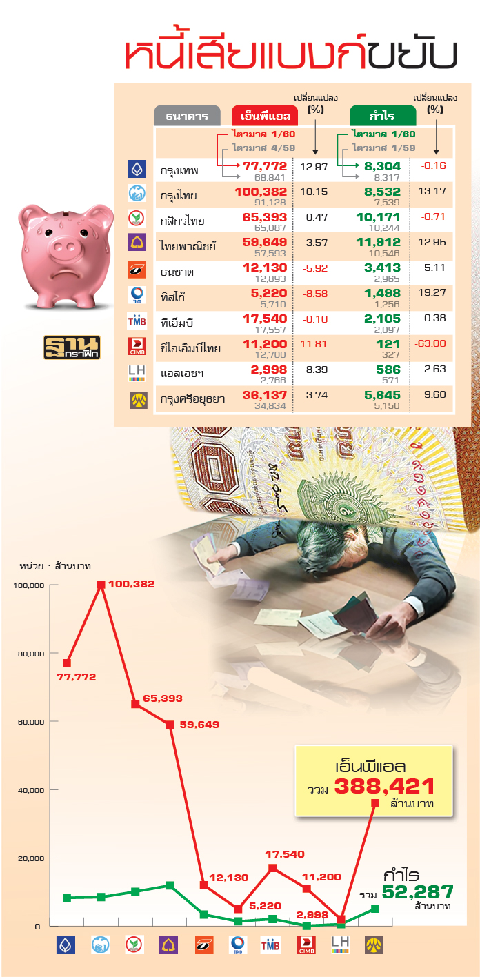 เอ็นพีแอลแบงก์ไตรมาสแรกพุ่ง 5.2% แตะ 3.88 แสนล้านบาท กระจายทุกภาคทั้งรายใหญ่ ที่อยู่อาศัย และเอสเอ็มอี ลางร้ายเศรษฐกิจฟื้นไม่เต็มที่ ขณะที่แบงก์กวาดกำไร 5.2 หมื่นล้านบาท โต 6.6%