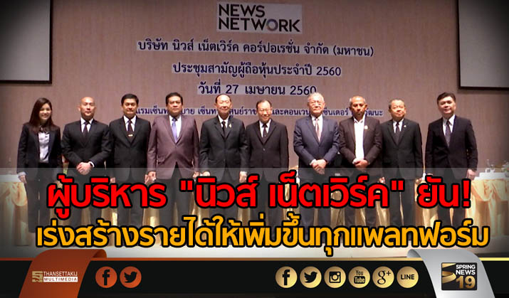 ผู้บริหารบริษัท นิวส์ เน็ตเวิร์ค คอร์ปอเรชั่น ยืนยัน ในที่ประชุมสามัญผู้ถือหุ้นประจำปี 2560 จะเร่งสร้างรายได้ให้เพิ่มขึ้นจากทุกแพลทฟอร์ม โดยกลุ่มวิทยุและนิวมีเดียร์เริ่มมีรายได้โดดเด่น ขณะที่ กรรรมการ 4 คน ที่หมดวาระได้รับเลือกจากผู้ถือหุ้นกลับมารับตำแหน่งเหมือนเดิม