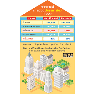 เมื่อพิจารณาในส่วนของการโอนคอนโดมิเนียมที่พบว่าในไตรมาส 1 ปี 2560 มียอดลดลง ทั้งนี้เป็นผลมาจากยอดขายเมื่อปี 2557-2558 ซึ่งในช่วงดังกล่าวมีการเปลี่ยนแปลงด้านการเมืองทำให้ตลาดตกอยู่ในภาวะชะลอตัว โดยยอดขายปี 2556 อยู่ที่ 1.9 แสนล้านบาท จำนวน 7.1 หมื่นหน่วย ขณะที่ยอดขายในปี 2557 อยู่ที่ 1.4 ล้านบาท จำนวน 4.9 หมื่นหน่วย และกลับมาฟื้นตัวอีกครั้งในปี 2558 ด้วยยอดขาย 1.8 แสนล้านบาท จำนวน 5.3 หมื่นหน่วย ด้วยเหตุนี้จึงทำให้ภาพรวมของตลาดไม่ดี เนื่องจากคอนโดมิเนียมมีสัดส่วนสูงถึง 55-60% ของตลาดรวมกรุงเทพฯ-ปริมณฑล