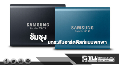 ซัมซุง เปิดตัว Samsung Portable SSD T5 โซลิดสเตตไดรฟ์ (Solid State Drive) แบบพกพารุ่นล่าสุดที่ยกระดับฮาร์ดดิสก์แบบพกพาขึ้นไปอีกขั้นด้วยขนาดกะทัดรัดและความทนทานสูง ผลิตโดยใช้เทคโนโลยีการเรียงชิปความจำแบบ 64-layer V-NAND ส่งผลให้ถ่ายโอนข้อมูลได้อย่างรวดเร็วที่สุดในกลุ่มโซลิดสเตตไดรฟ์แบบพกพา อีกทั้งยังมีคุณสมบัติการเข้ารหัสข้อมูลเพื่อความปลอดภัย ช่วยให้ผู้บริโภคสามารถเรียกใช้ข้อมูลที่สำคัญในโซลิดสเตตไดรฟ์ได้ทุกที่ทุกเวลา