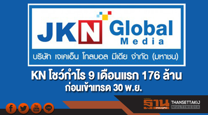 บริษัท เจเคเอ็น โกลบอล มีเดีย จำกัด (มหาชน) หรือ JKN แจ้งผลการดำเนินงานไตรมาส 3 สิ้นสุดวันที่ 30 ก.ย.2560 มีกำไรสุทธิ 93.57 ล้านบาท กำไรตอหุ้น 0.23 บาท เพิ่มขึ้นจากงวดเดียวกันของปีก่อนมีกำไรสุทธิ 36.36 ล้านบาท กำไรต่อหุ้น 0.09 บาท ส่วนงวด 9 เดือน ปี 2560 กำไรสุทธิ 176.11 ล้านบาท กำไรต่อหุ้น 0.44 บาท เพิ่มขึ้น 29.09% จากงวดเดียวกันของปีก่อนกำไรสุทธิ 136.42 ล้านบาท กำไรต่อหุ้น 0.34 บาท