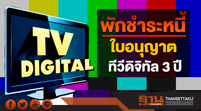 -15 มี.ค. 61- นายฐากร ตัณฑสิทธิ์ เลขาธิการคณะกรรมการกิจการกระจายเสียง กิจการโทรทัศน์ และกิจการโทรคมนาคมแห่งชาติ (กสทช.) แถลงภายหลังการประชุมคณะทำงานแก้ไขปัญหาทีวีดิจิตอลว่า ที่ประชุมเห็นตรงกันในมาตรการพักชำระค่าธรรมเนียมใบอนุญาตเป็นเวลา 3 ปี และ กสทช. จะช่วยรับผิดชอบค่าบริการโครงข่ายทีวีดิจิตอล โดยลดค่าเช่าโครงข่ายลง 50% เป็นเวลา 24 เดือน
