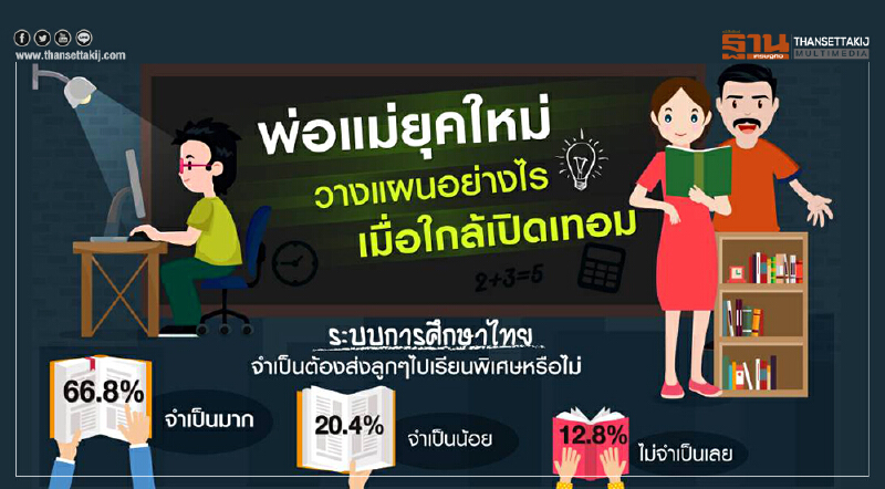 เมื่อถามว่าระบบการศึกษาไทยในปัจจุบันมีความจำเป็นเพียงใดที่ต้องส่งบุตรหลานไปเรียนพิเศษ พ่อแม่ส่วนใหญ่ร้อยละ 66.8 ระบุว่า จำเป็นมาก รองลงมาร้อยละ 20.4 ระบุว่าจำเป็นน้อย และมีเพียงร้อยละ 12.8 ระบุว่าไม่จำเป็นเลย