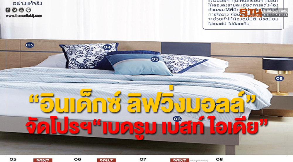อินเด็กซ์ ลิฟวิ่งมอลล์ (Index Living Mall) จัดโปรโมชั่น “เบดรูม เบสท์ ไอเดีย” (BEDROOM BEST IDEA) ชวนคนรักบ้านมาเพิ่มสไตล์ ให้ห้องนอนในฝันด้วยไอเดียสุดคูล ด้วยไอเดียการเลือกเฟอร์นิเจอร์, ของแต่งบ้าน, ของใช้ภายในบ้าน และการเลือกใช้โทนสี และสร้างบรรยากาศเพื่อการพักผ่อนสำหรับห้องนอน พบกับสินค้าคอลเลคชั่นใหม่ อาทิ ชุดห้องนอน, ชุดห้องนอนสำหรับเด็ก, โซฟา, อาร์มแชร์, ตู้อเนกประสงค์, ตู้วางทีวี, ชุดเครื่องนอน, หมอนอิง, โคมไฟ, นาฬิกา, แจกัน ฯลฯ พร้อมกับโปรโมชั่นพิเศษ อาทิ