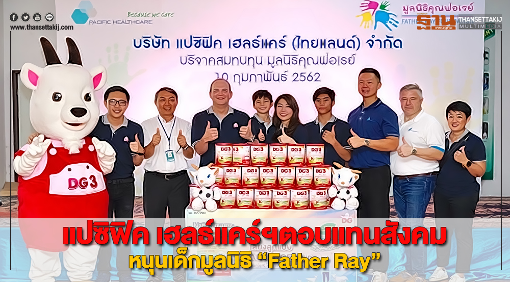 ทั้งนี้เพื่อเป็นการตอบแทนสังคมรวมทั้งสนับสนุนให้เด็กๆ ในมูลนิธิ “Father Ray” กว่า 850ชีวิต ได้มีสุขภาพร่างกายที่แข็งแรงเติบโตสมวัย บริษัท แปซิฟิค เฮลธ์แคร์ (ไทยแลนด์) จำกัด ร่วมสมทบทุนเงินสด 500,000 บาท(ห้าแสนบาทถ้วน) ร่วมกับ นายซีริล เฟรเดอริค เบอร์แมน ประธานกรรมการ กลุ่มบริษัทแปซิฟิค เฮลธ์แคร์ และครอบครัวบริจาคสมทบอีก 500,000 บาท (ห้าแสนบาทถ้วน) รวมยอดบริจาคทั้งหมด 1,000,000 บาทถ้วน ( หนึ่งล้านบาทถ้วน) พร้อมทั้งมอบผลิตภัณฑ์นมแพะ DG3 Advance Goldมูลค่า 100,000 บาท ให้กับมูลนิธิคุณพ่อเรย์ “Father Ray Foundation” โดยมีนายซีริล เฟรเดอริค เบอร์แมน ประธานกรรมการ กลุ่มบริษัทแปซิฟิค เฮลธ์แคร์ และ นายพาทริค โรมัน บรูล์มาน กรรมการและประธานเจ้าหน้าที่บริหาร กลุ่มบริษัทแปซิฟิค เฮลธ์แคร์ รวมทั้งทีมผู้บริหารและกลุ่มพนักงานในบริษัทร่วมเป็นสักขีพยาน เพื่อส่งต่อให้มูลนิธิฯได้นำผลิตภัณฑ์นมแพะผง DG ให้เด็กๆได้บริโภค เพื่อส่งเสริมสุขภาพที่ดีและมีความสุข เติบโตเป็นเยาวชนที่สมบูรณ์ทั้งกายและใจ ให้เด็กมีโภชนาการสมวัยและได้รับการส่งเสริมพัฒนาการด้านอื่นๆ อีกด้วย ตามนโยบายของ บริษัท แปซิฟิค เฮลธ์แคร์ (ไทยแลนด์) จำกัด “Because We Care”