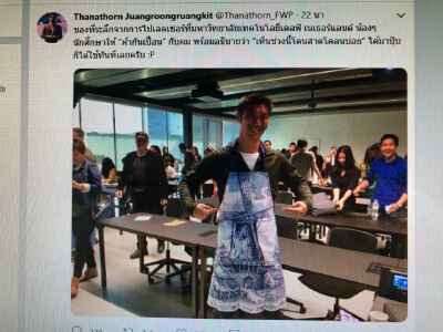 “ธนาธร”ชี้ของที่ระลึกจากการไปเลคเชอร์ที่ม.เทคโนโลยีเดลฟ์ เนเธอร์แลนด์ น้องๆ นักศึกษาให้ผ้ากันเปื้อนกับตนเอง พร้อมอธิบายว่า “เห็นช่วงนี้โดนสาดโคลนบ่อย” ได้มาปุ๊บก็ได้ใช้ทันทีเลย