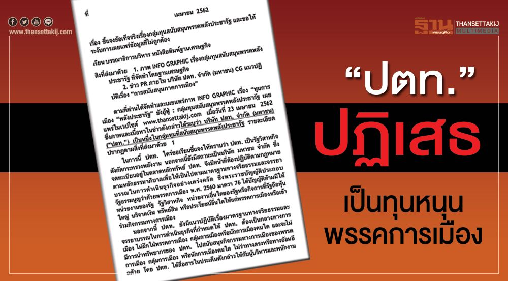 ตามที่ “ฐานเศรษฐกิจ” ได้เผยแพร่ภาพ INFO GRAPHIC เรื่อง “ทุนการเมือง “พลังประชารัฐ” ยังอู้ฟู่ : กลุ่มทุนสนับสนุนพรรคพลังประชารัฐ เผยแพร่ในเวปไซต์ www.thansettakij.com เมื่อวันที่ 23 เมษายน 2562 ซึ่งภาพและเนื้อหาในข่าวดังกล่าวได้ระบุว่า บริษัท ปตท. จำกัด (มหาชน) (“ปตท.”) เป็นหนึ่งในกลุ่มทุนที่สนับสนุนพรรคพลังประชารัฐนั้น