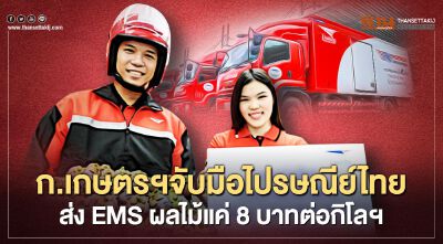 ก.เกษตรฯ ร่วมมือไปรษณีย์ไทย คิดค่าบริการ EMS ขนส่งผลไม้ถึงมือผู้บริโภคทั่วไทยในราคาถูกเป็นพิเศษ 8 บาทต่อกก. เหมาจ่ายน้ำหนักไม่เกิน 5 กก. คิดแค่ 30 บาทต่อกล่องช่วยกระจายผลผลิตเกษตรกร