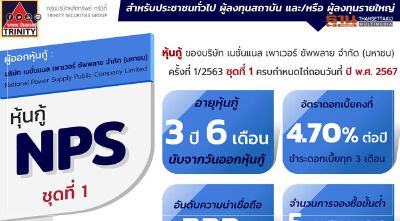 บริษัทหลักทรัพย์ ทรีนีตี้ จำกัด ในฐานะผู้ร่วมจัดจำหน่ายหุ้นกู้ของ บริษัท เนชั่นแนล เพาเวอร์ ซัพพลาย จำกัด (มหาชน) (“NPS”) เตรียมเสนอขายหุ้นกู้ NPS ชนิดระบุชื่อผู้ถือ ประเภทไม่ด้อยสิทธิ ไม่มีประกัน และมีผู้แทนผู้ถือหุ้นกู้ ครั้งที่ 1/2563 ชุดที่ 1 ครบกำหนดไถ่ถอนปี พ.ศ. 2567 โดยให้สิทธิผู้ออกหุ้นกู้สามารถไถ่ถอนได้ก่อนกำหนดให้แก่ประชาชนทั่วไประหว่างวันที่ 3- 6 สิงหาคมนี้ ราคาหน่วยละ 1,000 บาท จองซื้อขั้นต่ำ 5 แสนบาท โดยหุ้นกู้ของ NPS กำหนดผลตอบแทนด้วยอัตราดอกเบี้ยคงที่ ร้อยละ 4.70 ต่อปี อายุ 3 ปี 6 เดือน ชำระดอกเบี้ยทุก 3 เดือนตลอดอายุหุ้นกู้ ทั้งนี้ การเสนอขายหุ้นกู้ครั้งนี้ หุ้นกู้ได้รับการจัดอันดับความน่าเชื่อถือระดับ “BBB-/stable” โดยบริษัท ทริสเรทติ้ง จำกัด เมื่อวันที่ 11 มีนาคม 2563 และบริษัทได้ดำเนินการยื่น Filing ต่อสำนักงาน ก.ล.ต. เมื่อ 16 ก.ค. 63 ที่ผ่านมา