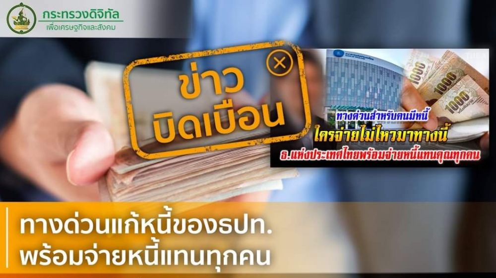 จากกรณีที่มีการโพสต์และแชร์ข้อความในสื่อต่างๆ เกี่ยวกับประเด็นเรื่อง "ทางด่วนแก้หนี้ของธปท. พร้อมจ่ายหนี้แทนทุกคน" ทางศูนย์ต่อต้านข่าวปลอมได้ดำเนินการตรวจสอบข้อเท็จจริงโดย ธนาคารแห่งประเทศไทย (ธปท.) พบว่าประเด็นดังกล่าวนั้น เป็นข้อมูลบิดเบือน