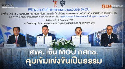 ผู้สื่อข่าวรายงาน ( 22 ก.ย.2563)ว่า สำนักงานคณะกรรมการการแข่งขันทางการค้า (สขค.) ได้จัดพิธีลงนามบันทึกข้อตกลงความร่วมมือ(MOU)ด้านการกำกับดูแลการแข่งขันในธุรกิจเกี่ยวกับกิจการกระจายเสียงกิจการโทรทัศน์ และกิจการโทรคมนาคม โดยนายสมศักดิ์ เกียรติชัยลักษณ์ เลขาธิการคณะกรรมการการแข่งขันทางการค้า กับ นายไตรรัตน์ วิริยศิริกุล รองเลขาธิการ รักษาการเลขาธิการคณะกรรมการกิจการกระจายเสียง กิจการโทรทัศน์ และกิจการโทรคมนาคมแห่งชาติ(กสทช.) มีศาสตราจารย์สกนธ์ วรัญญูวัฒนา ประธานกรรมการการแข่งขันทางการค้า และ ผู้ช่วยศาสตราจารย์ ดร.ธวัชชัย จิตรภาษ์นันท์ กรรมการกิจการกระจายเสียงกิจการโทรทัศน์ และกิจการโทรคมนาคม ร่วมเป็นสักขีพยาน ณ ห้องประชุม ชั้น 4 โรงแรมโนโวเทล กรุงเทพ สยามสแควร์ กรุงเทพมหานคร