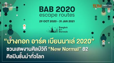 เทศกาลศิลปะร่วมสมัยนานาชาติ “บางกอก อาร์ต เบียนนาเล่ 2020”(Bangkok Art Biennale) กับความยิ่งใหญ่ระดับโลก ที่จะเนรมิตกรุงเทพฯ สู่เมืองแห่งศิลปวัฒนธรรมระดับโลก โดยมีหัวเรือใหญ่อย่าง บริษัท ไทยเบฟเวอเรจ จำกัด (มหาชน) ผสานความร่วมมือครั้งสำคัญจากภาครัฐและเอกชน ได้แก่ การท่องเที่ยวแห่งประเทศไทย, กรุงเทพมหานคร, สำนักงานส่งเสริมการจัดประชุมและนิทรรศการ (TCEB),วัน แบงค็อก, บริษัท ปูนซิเมนต์ไทย จำกัด (มหาชน) (SCG), บริษัท โตโยต้า มอเตอร์ ประเทศไทย จํากัด, บริษัท อาคเนย์ประกันภัย จํากัด (มหาชน), บริษัท พีเอ็ม เซ็นเตอร์ จำกัด, อมรินทร์ทีวีช่อง 34, บริษัท จีเอ็มเอ็ม แชนแนล จำกัด และสถานเอกอัครราชทูตต่างประเทศประจำประเทศไทย ในฐานะเป็นผู้สนับสนุนหลัก และเครือข่ายพันธมิตร ทุกภาคส่วน ชวนเสพงานศิลป์วิถี “New Normal” พร้อมประกาศรายชื่อ 82 ศิลปินชั้นนำทั่วโลก จาก 35 ประเทศ รวม 5 ทวีป ที่จะมาสร้างความอลังการและความยิ่งใหญ่ให้กับวงการศิลปะไทย ด้วยผลงานศิลปะกว่า 200 ชิ้น กับแนวคิดหลักสุดท้าทาย “Escape Routes” หรือ “ศิลป์สร้าง ทางสุข” ที่จะนำมาจัดแสดงบน 9 สถานที่สำคัญใจกลางกรุงเทพมหานครได้แก่ เดอะ ปาร์ค / BAB BOX / เดอะ พรีลูด โครงการวัน แบงค็อก จัดแสดงตั้งแต่วันที่ 12 ตุลาคม 2563 และ วัดพระเชตุพนวิมลมังคลาราม ราชวรมหาวิหาร / วัดอรุณราชวราราม ราชวรมหาวิหาร / วัดประยุรวงศาวาสวรวิหาร / หอศิลปวัฒนธรรมแห่งกรุงเทพมหานคร / ล้ง 1919 / มิวเซียมสยาม ที่จะจัดแสดงตั้งแต่วันที่ 29 ตุลาคม 2563 จนถึงวันที่ 31 มกราคม 2564