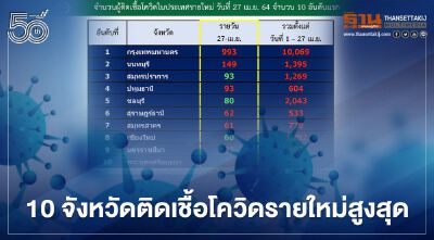 จำนวนผู้ติดเชื้อโควิด-19 ในประเทศรายใหม่ วันที่ 27 เม.ย.64 จำนวน 10 อันดับแรก