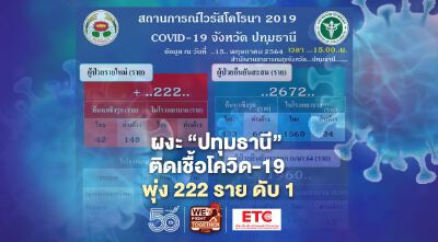"ปทุมธานี"ติดเชื้อโควิด-19 รายใหม่ ทุบสถิติพุ่ง 222 ราย ยอดป่วยสะสม 2,672 ราย หายป่วย 1,285 ราย เสียชีวิตเพิ่ม 1 ราย รวม 17 ราย