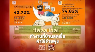 ทั้งนี้ ประชาชนร้อยละ 88.33 ระบุ ทำงานที่บ้านลดการแพร่ระบาดของเชื้อโควิด-19 ขณะร้อยละ 65.80 ระบุ ค่าใช้จ่ายเพิ่มขึ้น เช่น ค่าน้ำ ค่าไฟ ค่าอินเทอร์เน็ต