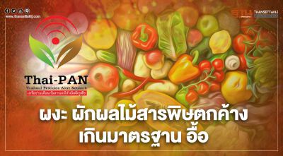 นางสาวปรกชล อู๋ทรัพย์ ผู้ประสานงานเครือข่ายเตือนภัยสารเคมีกำจัดศัตรูพืช หรือ Thai-PAN ได้เปิดผลการตรวจวิเคราะห์พบว่า มีผักและผลไม้มากถึง 58.7 % ที่พบสารพิษตกค้างเกินมาตรฐาน ทั้งนี้โดยผักที่พบการตกค้างเกินมาตรฐานมากที่สุดคือ มะเขือเทศผลเล็ก พริกขี้หนู พริกแดง ขึ้นฉ่าย คะน้า พบตกค้างเกินมาตรฐานทั้งหมดทุกตัวอย่าง (100%) จากที่เก็บมาชนิดละ 16 ตัวอย่าง ผักผลไม้ที่พบการตกค้างรองลงมาได้แก่ กะเพรา (81%) มะระ (62%) ผักบุ้ง (62%) หัวไชเท้า (56%) บร็อกโคลี (50%) ถั่วฝักยาว (44%) แครอท (19%) กระเจี๊ยบเขียว (6%) และหน่อไม้ฝรั่ง (6%) ส่วนมันฝรั่งพบการตกค้างในระดับไม่เกินมาตรฐาน และข้าวโพดหวานไม่พบการตกค้างเลย
