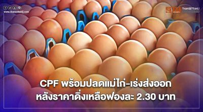 ซีพีเอฟ ขานรับนโยบายรัฐเร่งแก้ราคาไข่ตกต่ำ ให้ความร่วมมือปลดแม่ไก่ยืนกรง-เร่งส่งออกไข่ หลังราคาไข่ตกเหลือแค่ฟองละ 2.30 บาท
