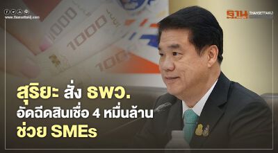“สุริยะ” สั่ง “ธพว.” อัดฉีดสินเชื่อ 4 หมื่นล้านบาทช่วย “เอสเอ็มอี” สร้างมูลค่าเศรษฐกิจกว่า 9 หมื่นล้านบาท มุ่งเสริมสภาพคล่อง กระจายการสร้างงาน สร้างรายได้