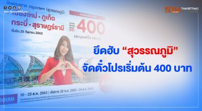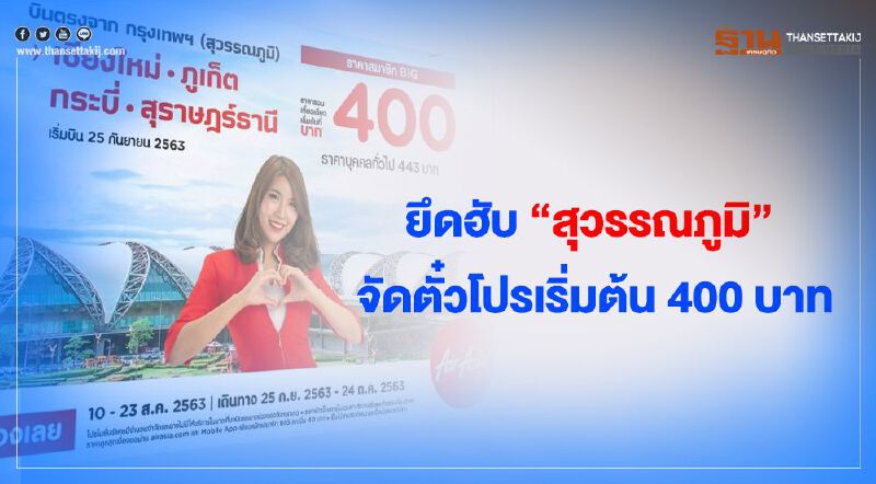 ไทยแอร์เอเชีย (แอร์เอเชีย) ประกาศความพร้อมดัน สนามบินสุวรรณภูมิ เป็นศูนย์กลางการบิน (ฮับ)บินแห่งใหม่ เปิด 4 เส้นทาง จากกรุงเทพฯ(สนามบินสุวรรณภูมิ) สู่ เชียงใหม่,ภูเก็ต,กระบี่,สุราษฏร์ธานี เริ่มทำการบินวันที่ 25 กันยายนนี้  พร้อม จัดโปรโมชั่นตั๋วเครื่องบินเปิดตัวเส้นทางใหม่ เริ่มต้นที่ 400 บาท สำหรับสมาชิกBIG และราคาบุคคลทั่วไป เริ่มต้นที่ 443 บาท โดยเปิดให้จองตั้งแต่วันที่ 10-23 ส.ค.63 เดินทางได้ตั้งแต่ 25 ก.ย.-24 ก.ค.63