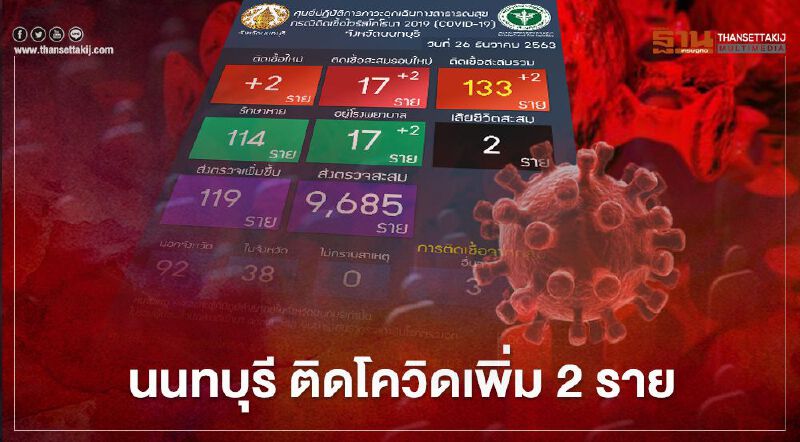 วันที 26 ธ.ค. 63 เวลา 18.00 น. ศูนย์ข้อมูล COVID-19 นนทบุรี เผยข้อมูลทางแฟนเพจ “ศูนย์ปฏิบัติการ COVID-19 จังหวัดนนทบุรี” ระบุว่า สถานการณ์ COVID-19 จังหวัดนนทบุรี วันที่ 26 ธันวาคม 2563 พบผู้ป่วยยืนยันเพิ่ม 2 คน ผู้ป่วยยืนยันสะสม รอบใหม่ 17 คน ผู้ป่วยยืนยันสะสม ทั้งหมด 133 คน