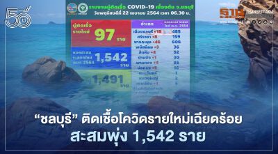 ติดเชื้อรายวันเพิ่มยังสูง"ชลบุรี" วันนี้ (22 เม.ย.) พบอีก 97 ราย ส่วนใหญ่จากสัมผัสผู้ป่วยโควิด-19 ในครอบครัว-สถานบันเทิง ยอดสะสมระลอกใหม่ 1,542 ราย