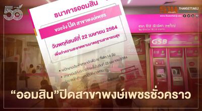 ธ.ออมสิน สาขาพงษ์เพชร พบผู้ติดเชื้อโควิด-19 แจ้งปิดสาขาชั่วคราว พร้อมเปิดให้บริการในวันพรุ่งนี้ 23 เม.ย.