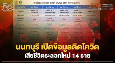 นอกจากนี้เพจศูนย์ข้อมูล COVID-19 ได้สรุปข้อมูลผู้เสียชีวิตระลอกใหม่ประจำเดือน เม.ย. 64 จ.นนทบุรี รวม 14 ราย เป็นชาย 11 ราย และหญิง 3 ราย มีอายุเฉลี่ย 47 ปี ( 29 - 70 ปี) ติดจากการสัมผัสใกล้ชิดกับผู้ป่วยยืนยืนในครอบครัว 11 ราย (สัมผัสช่วงเทศกาลสงกรานต์) มีโรคประจำตัว 9 ราย มี 2 ครอบครัว ที่เสียชีวิต ครอบครัวละ 2 ราย เข้า Admit หลังจากมีอาการเฉลี่ย 3.6 วัน (0 - 12 วัน) และ Admit เฉลี่ย 5 วัน (0-14)