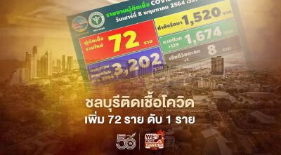 "ชลบุรี"พื้นที่สีแดงวันนี้ (8 พ.ค.) ติดเชื้อโควิดรายใหม่เพิ่ม 72 ราย เสียชีวิต 1 ราย ยอดสะสมพุ่ง 3,202 ราย หายป่วยแล้ว 1,674 ราย