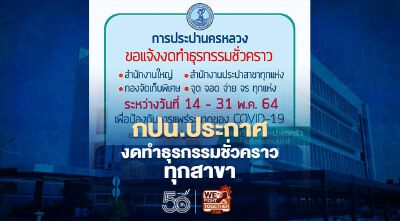 วันที่ 14-31 พ.ค. กปน. งดทำธุรกรรมชั่วคราว ทั้งสำนักงานใหญ่ สำนักงานประปาสาขาทุกสาขา กองจัดเก็บพิเศษ และจุดจอด จ่าย จรทุกแห่งของ เพื่อป้องกันการแพร่ระบาดของโควิด-19