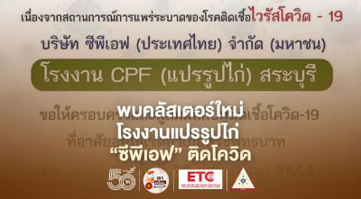 ผู้ว่าฯ สระบุรี เผย พบคลัสเตอร์โรงงานแปรรูปเนื้อไก่ "ซีพีเอฟ" แก่งคอย พนักงานติดเชื้อโควิดแล้ว 245 ราย ประกาศสั่งปิดโรงงาน 5 วัน จัดตั้งรพ.สนามในพื้นที่ของบริษัทฯ รอบรับผู้ติดเชื้อได้ 400 ราย