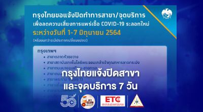 ล่าสุด ธนาคารกรุงไทยขอแจ้งปิดทำการสาขา/จุดบริการ เพื่อลดความเสี่ยงของการแพร่เชื้อ COVID-19 ระลอกใหม่ ระหว่างวันที่ 1-15 มิถุนายน 2564 (จนกว่าจะมีประกาศเปลี่ยนแปลง) ดังนี้