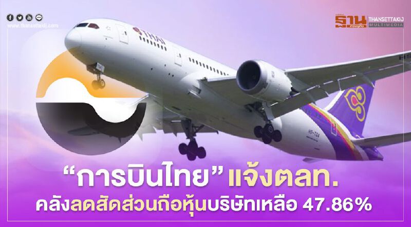 "การบินไทย" แจ้งตลท. คลังลดสัดส่วนถือหุ้นเหลือ 47.86% หลังขายหุ้น 3.17% ให้กับกองทุนวายุภักษ์1 ส่งผลให้บริษัทพ้นสภาพเป็นรัฐวิสาหกิจตามกฏหมาย