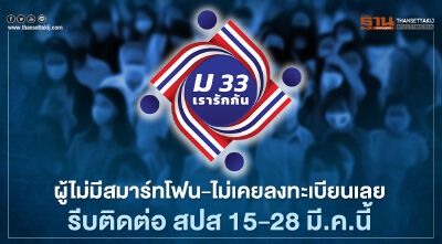 "ม33เรารักกัน"ย้ำผู้ไม่มีสมาร์ทโฟน-ไม่เคยลงทะเบียนเลย  รีบติดต่อลงทะเบียนที่สนง.ประกันสังคม 15 – 28 มี.ค.นี้  รับสิทธิเยียวยา 4,000 บาท