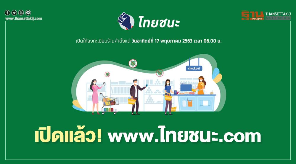 รัฐบาลเปิดแพลตฟอร์ม “ไทยชนะ” เพื่อป้องกันและลดความเสี่ยงการแพร่กระจายโรคโควิด-19 ผ่านเว็บไซต์ www.ไทยชนะ.com สำหรับเป็นช่องทางให้ร้านค้าทั่วประเทศที่ได้รับการผ่อนปรน ระยะที่ 2 ลงทะเบียนตั้งแต่ วันอาทิตย์ที่ 17 พฤษภาคม 2563 เวลา 06.00 น.