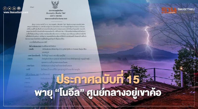 กรมอุตุฯประกาศเตือนฉบับที่ 15 "พายุ"โนอึล อ่อนกำลังลงเป็นพายุระดับ 2 (ดีเปรสชัน) ศูนย์กลางอยู่บริเวณเขาค้อ จังหวัดเพชรบูรณ์ 45 จังหวัด มีฝนตกหนักถึงหนักมาก