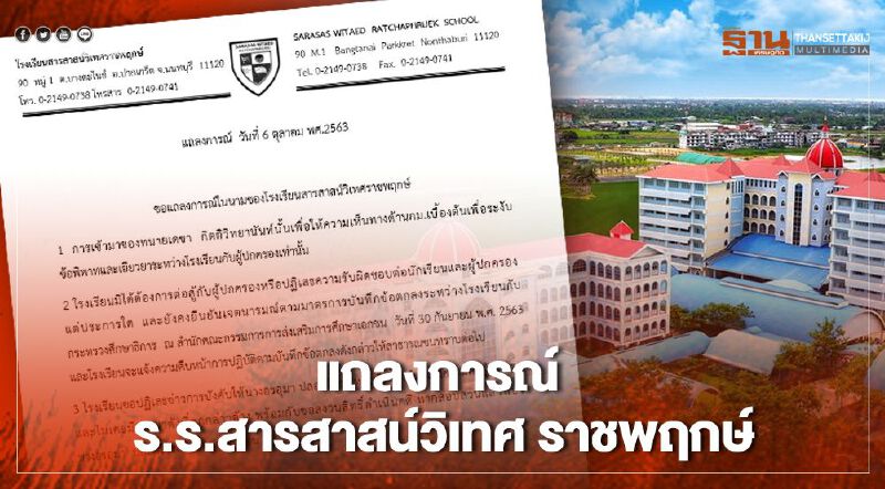 เมื่อช่วงค่ำวันที่ 6 ตุลาคม 2563 โรงเรียนสารสาสน์วิเทศราชพฤกษ์ ได้ออกแถลงการณ์ระบุว่า