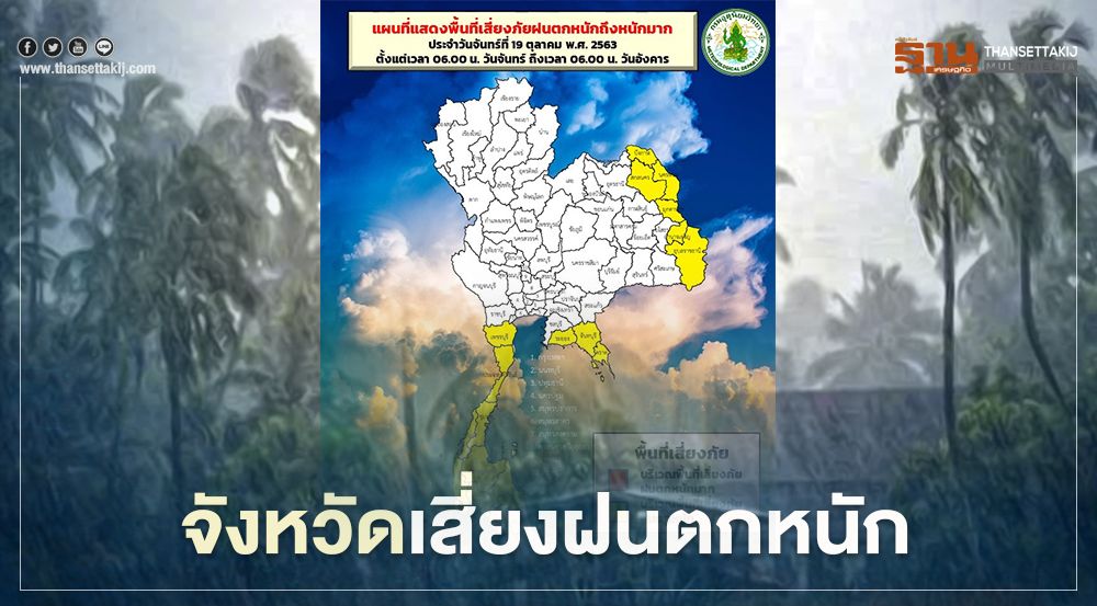 ผู้สื่อข่าวรายงานว่า กองพยากรณ์อากาศ กรมอุตุนิยมวิทยา กระทรวงดิจิทัลเพื่อเศรษฐกิจและสังคม เปิดเผย การพยากรณ์อากาศ พร้อมกราฟิกแสดงพื้นที่เสี่ยงภัยฝนตกหนักถึงหนักมาก ประจำวันจันทร์ที่ 19 ตุลาคม 2563 ตั้งแต่เวลา 06.00 น.ถึงเวลา 06.00 น.วันอังคาร ระบุว่า